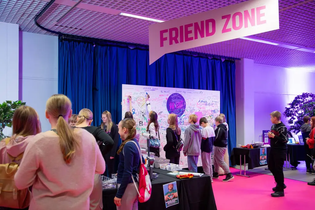 Bright Fridayssa nuoret pääsivät tänäkin vuonna monen mukavan aktiviteetin pariin, eikä vatsakaan kurninut, kun tarjolla oli hodareita ja naposteltavaa. Nuoret pelailivat yhdessä, loihtivat yhteisötaidetta ja askartelivat pinssejä – ja tietysti seurasivat monenlaista lavaohjelmaa. Roni Bäckin ja nuoriso-ohjaaja Mari Katri-Lempisen keskusteluihin nuoret saattoivat chatata mieltä askarruttavia kysymyksiä.