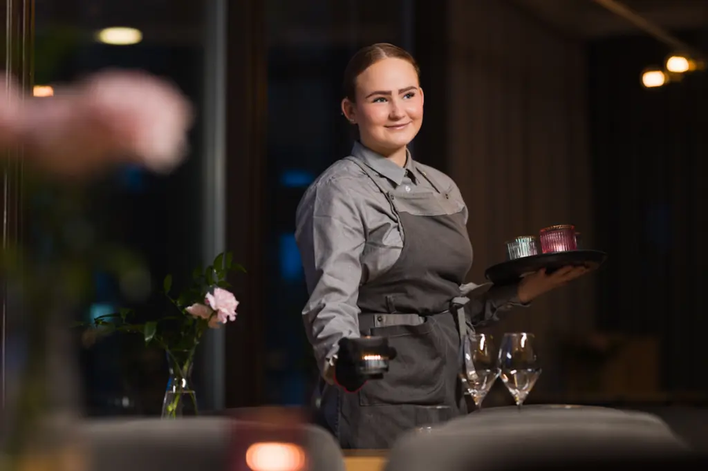 Vaikka tarjoilijan työtä tehdään usein yksin, Saara ja Milla ovat huomanneet, että varsinkin kilpailutilanteessa he loistavat nimenomaan kaksikkona.– Meillä molemmilla on omat vahvuutemme, jotka täydentävät toisiaan. Kilpailutilanteet ovat aina tosi jännittäviäkin, ja silloin kaverilta saa myös paljon kaivattua tukea.Millan supervoima on kokonaisuuden hahmottaminen, Saaran asioiden viimeistely. Kilpailuissa tuomarit seuraavat nimenomaan sitä, kuinka hyvin pari puhaltaa yhteen hiileen.– Parikisassa ei yksinkertaisesti pärjää, jos keskittyy vain omaan suoritukseen. Taitaja-semifinaali olikin meille molemmille jännempi paikka, kun siellä kilpailtiin yksilöinä.Rakkaus ravintola-alaan kumpuaa kummankin puheesta. Suurin kiitos työstä on asiakkailta saatu hyvä palaute.– Onhan se todella lämmin fiilis, kun on omalla työllä ja asenteella tehnyt jonkun ravintolakokemuksesta astetta erityisemmän, kaksikko hymyilee.Sinustako pokkilainen? Hae meidän työkaveriksi!