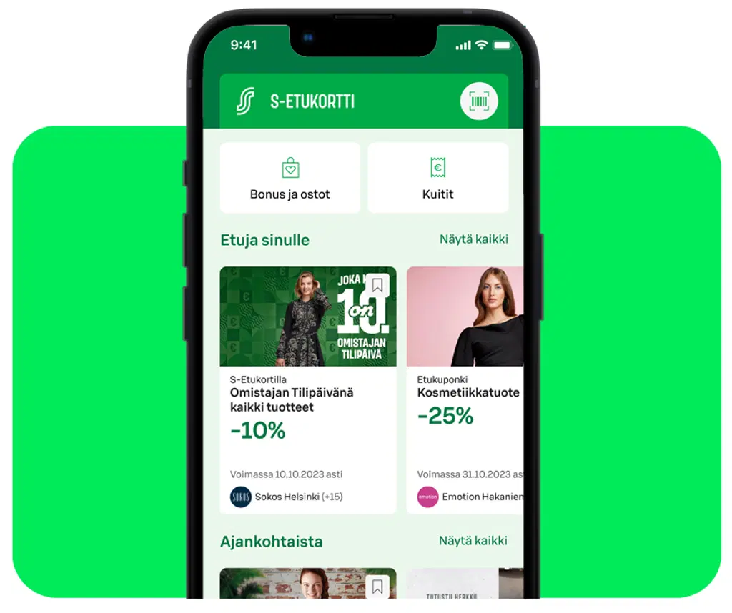 Kampanja on voimassa 1.1.–31.5.2026. Edut tulee käyttää 2 kuukauden sisällä liittymisestä.HUOM! Mikäli olet merkinnyt tietoihisi Analytiikan, profiloinnin ja asiakasryhmittelyn kiellon tai Tuotetasoisen ostotiedon käsittelyn kiellon, liittymisedut eivät tule näkyviin S-mobiilissa. Kiellot voit poistaa S-mobiilissa ja S-Etukortti.fi sivulla tunnistautuneena. Eston poistamisen jälkeen edut tulevat näkyviin muutaman päivän sisällä.S-mobiilissa etukupongit löytyvät klikkaamalla alareunasta "S-Etukortti". Kaikki etukupongit näkee klikkaamalla Etuja sinulle -otsikon vierestä "Näytä kaikki" -painiketta.